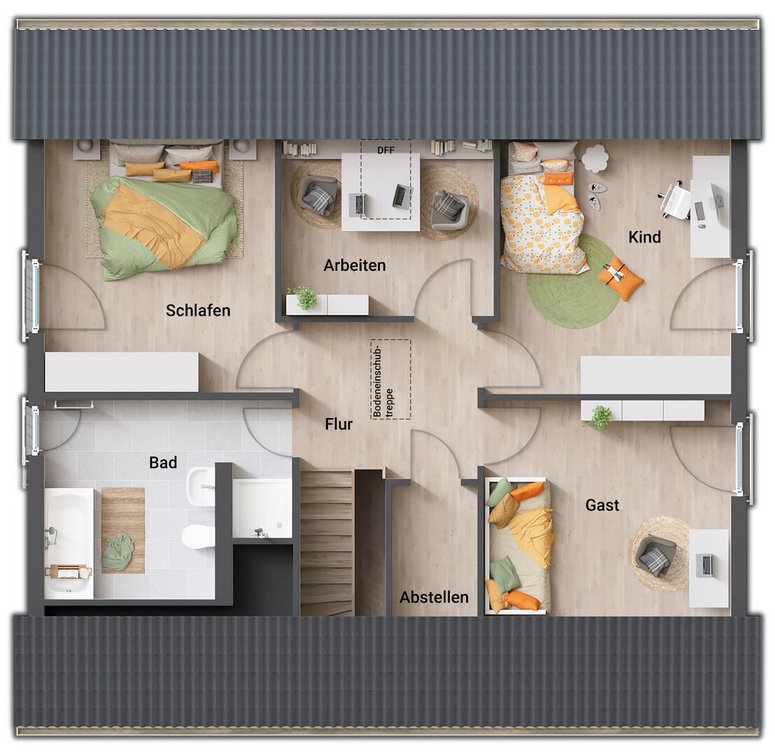Das Mitwachshaus Flair 148 ist für alle Lebensphasen gut gerüstet. Es kann sowohl im Erdgeschoss, als auch im Dachgeschoss ein weiteres Zimmer eingeplant werden. Diesen zusätzlichen Platz können Sie bei Bedarf für ein weiteres Kinderzimmer oder ein Büro nutzen. Im Dachgeschoss gibt es weiter die Möglichkeit eine kleine Einliegerwohnung zu integrieren.