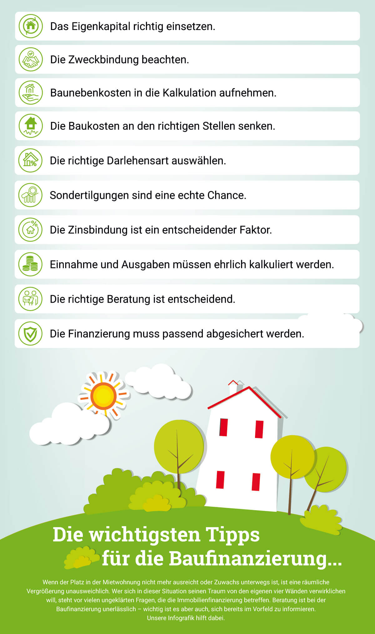 Um die Kosten für die Finanzierung des Fertighauses so gering wie möglich zu halten, sind mehrere Angebote zu vergleichen. Auch eine unabhängige (!) Fachberatung ist in dieser Hinsicht sehr aufschlussreich. Aktuell befinden sich die Zinsen auf einem sehr niedrigen Niveau, sodass die Finanzierung recht kostengünstig umzusetzen ist. Aber niemand kann mit Bestimmtheit voraussagen, wie sich die Zinsen in den nächsten 10 bis 20 Jahren ändern. Daher kann es nicht DIE beste Finanzierung geben.
