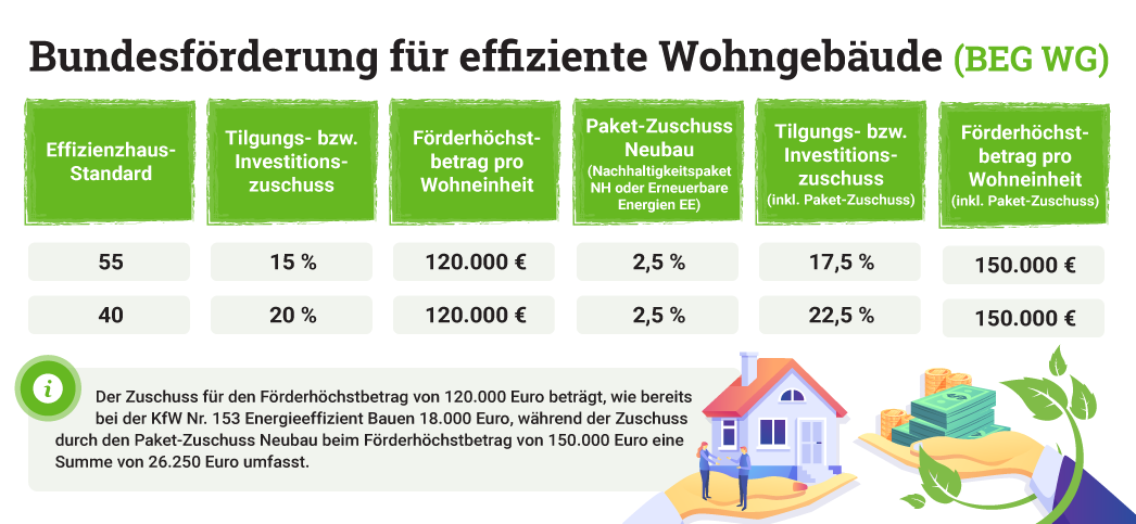 Die Höhe der Leistung beträgt je Wohneinheit bis zu 120.000 Euro. Bei einem Effizienzhaus der EE- oder NH-Klasse sowie einer Unterkunft des KfW-Standards 40 Plus sind bis zu 150.000 Euro zu erhalten.