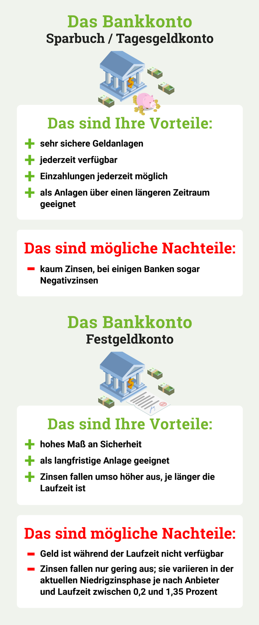Das Bankkonto als Anlageform umfasst das Sparbuch, Tagesgeldkonto und das Festgeldkonto. Ein Girokonto zählt nicht zu den Kapitalanlagen. Es dient der Sicherung der Liquidität und beinhaltet in der Regel keine Guthabenzinsen. Bei den anderen Arten von Bankkonten sind die Zinsen von der marktüblichen Zinssituation abhängig. Bankkonten sind sicher, weil das Ersparte bei Insolvenz der Bank über die sogenannte Einlagensicherheit bis zu 100.000 Euro geschützt ist.