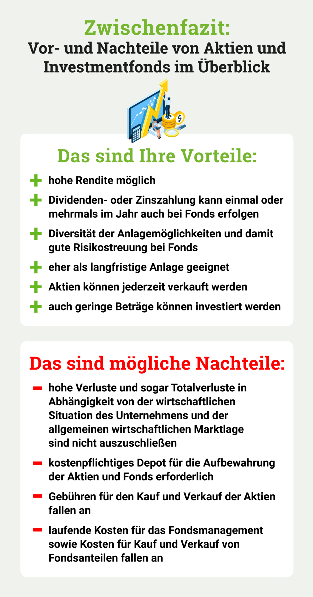 Wie hoch die Rendite ausfallen kann und welches Risiko Sie eingehen, hängt vom gewählten Fonds ab. Sie benötigen auch bei den Fonds ein Depot zur Aufbewahrung der Wertpapiere.