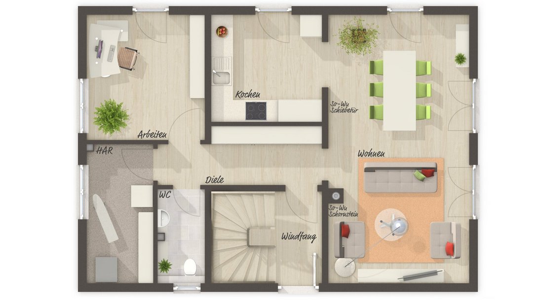Bauherren sind dank bodentiefer Fenster, klassischer Architektur und individuellem Grundriss vom Bodensee 129 begeistert. Dieses Massivhaus ist das ideale Zuhause für Familien mit Kindern. Angefangen beim Erdgeschoss mit großzügigem Wohnbereich, halboffener Küche und Home-Office bis hin zum Dachgeschoss mit Schlafzimmer inklusive Ankleide, Kinderzimmer sowie Gästezimmer. In diesen vier Wänden genießen Sie Freiraum und Individualität in vollen Zügen. Denn dieses Einfamilienhaus kann sich Ihren Bedürfnissen und Wünschen jederzeit anpassen, ob weitere Kinderzimmer oder zwei Büros im Eigenheim. Im Bodensee 129 sind Ihnen keine Grenzen gesetzt.