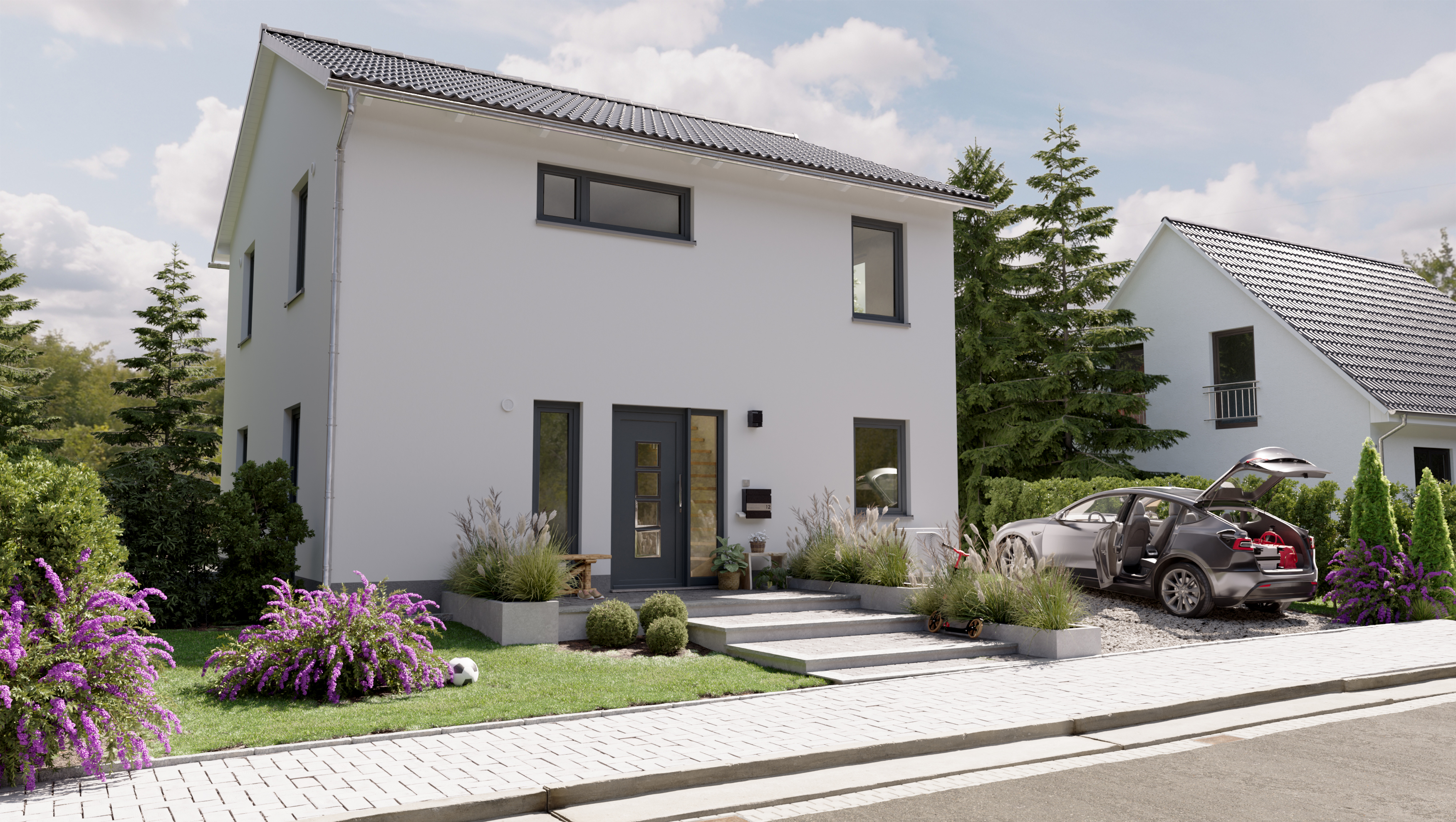 Nutzen Sie gerne auch unseren 3D-Hauskonfigurator, um sich mit dem Grundriss und zahlreichen Gestaltungsoptionen detaillierter vertraut machen zu können. Klicken Sie einfach auf einen Haustypen, um in die 3D-Ansicht zu gelangen. Sie sehen dann einen Auszug aus den unterschiedlichen Gestaltungsoptionen im Außenbereich und entwickeln ein Gefühl für die Hausgröße.
